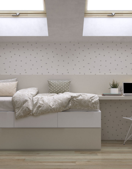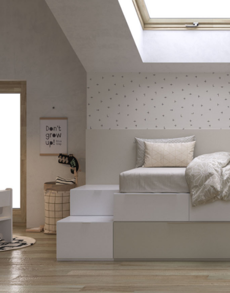 Composición juvenil en tonos neutros pensada para dos hermanos de diferentes edades que comparten habitación. La zona de descanso está compuesta por módulos apilables siendo uno de ellos la base de la cama nido. Además de un escritorio y a la izquierda una zona de juegos para el más peque.