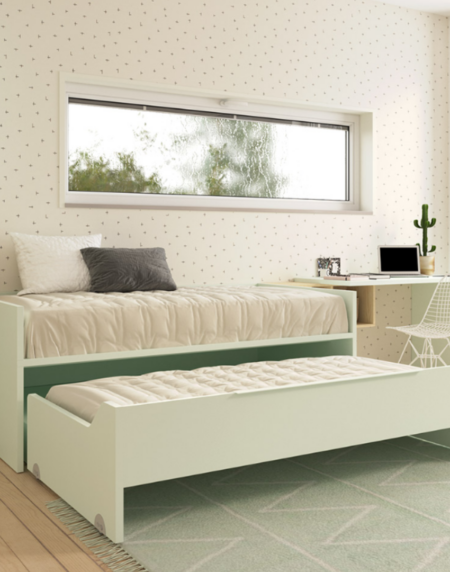 Composición juvenil muy lineal y de tonos suaves, ideal para que tus hijos disfruten invitando a sus amigos a dormir en la cómoda cama nido o a preparar el próximo examen en su práctico escritorio doble. Totalmente personalizable en medidas, materiales y colores.