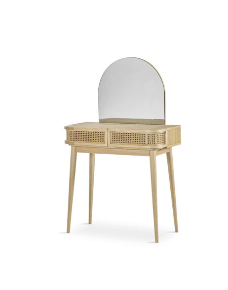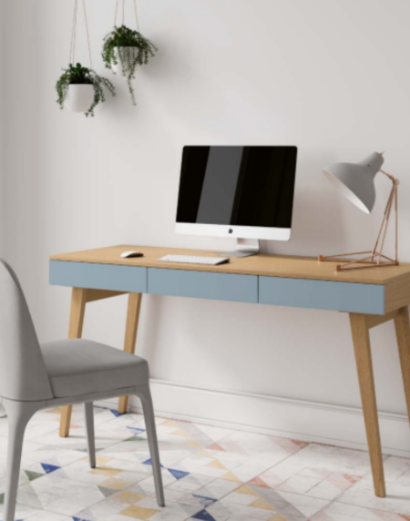 Mesa de escritorio en madera de roble con cajones en Celeste. Las patas pueden ser en madera o aluminio a elegir entre blanco o negro. En este caso es aluminio blanco.