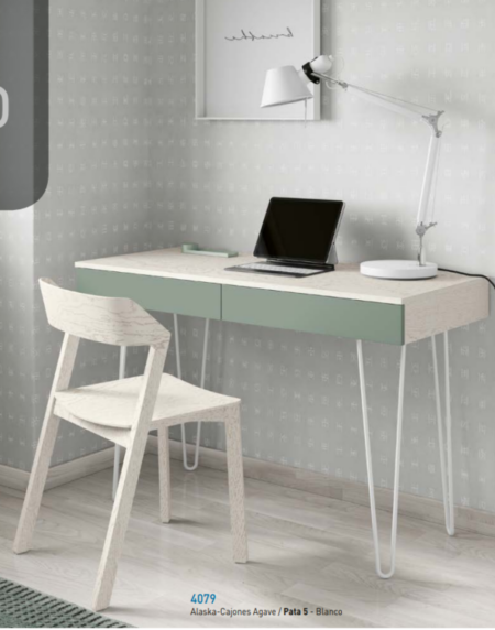 Mesa de escritorio con cajones en color blanco Alaska combinado con los cajones en Agave. Las patas pueden ser en madera o aluminio a elegir entre blanco o negro. En este caso es aluminio blanco.