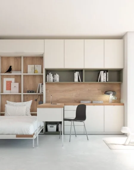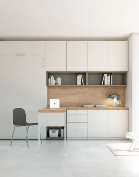 Como las necesidades son diferentes en este espacio puedes ver una zona home office muy completa con una cama abatible para invitados.