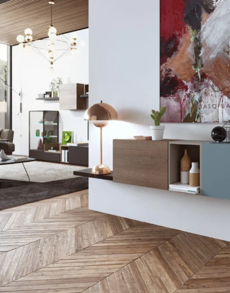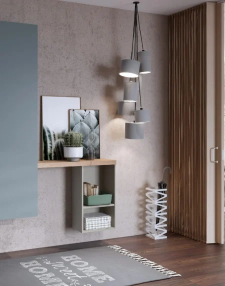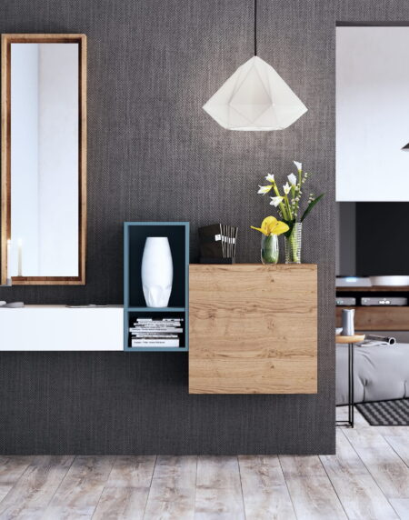 Atractiva combinación de módulos suspendidos acompañados de un marco espejo a juego con al acabado Roble Montana.
