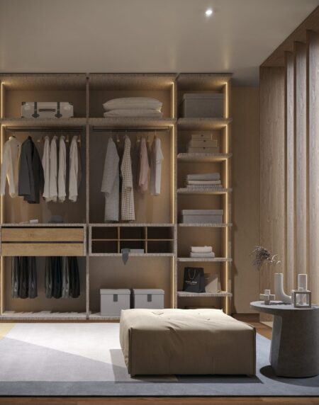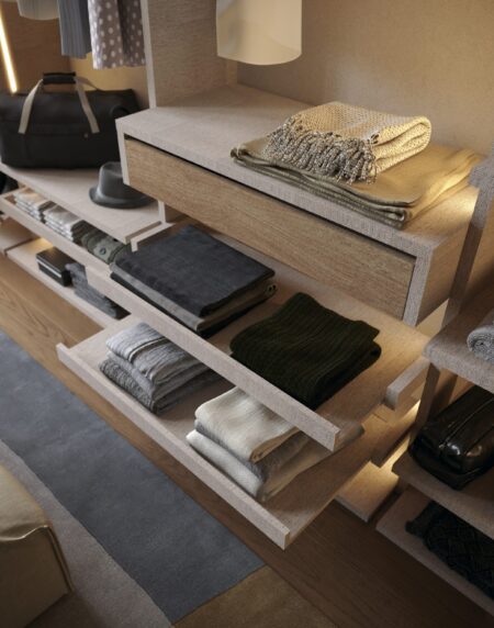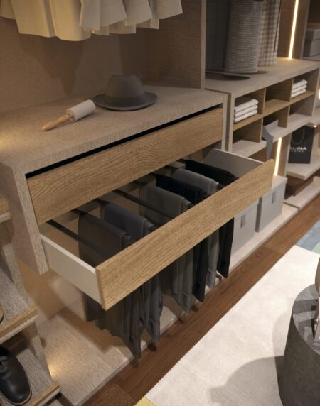 El vestidor MS027 combina acabados en laminados Coco y Roble Split. Una propuesta funcional con estantes fijos y extraíbles, barras para colgar y un módulo de dos cajones colgantes con luz interior integrada.