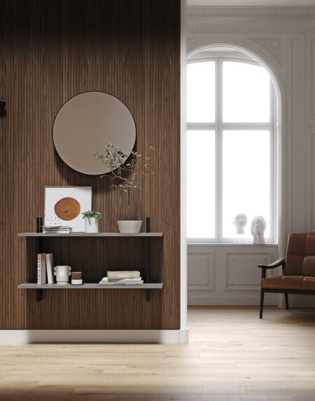 Recibidor de 120 cm en cuerda mate compuesto de 2 estantes y espejo redondo. Además, cuenta con la posibilidad de revestir la pared con nuestros paneles alistonados.