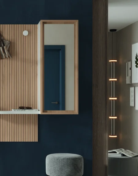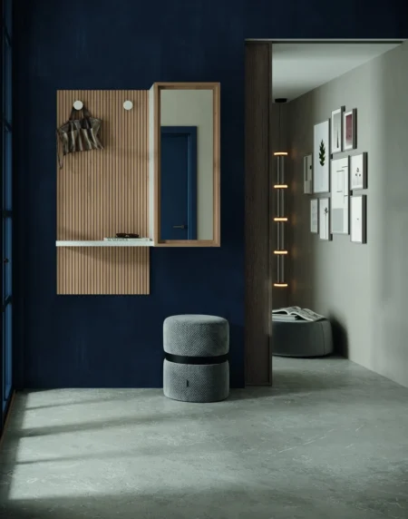 Recibidor con acabados en Grafito Mate, Roble Humo, Cuerda Mate y Blue Marine Mate.