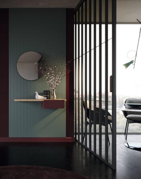 Ligera composición con espejo redondo, un estante y un practico cajón que conforman un sencillo recibidor. Cuenta con un panel alistonado opcional en diferentes lacas y medidas.