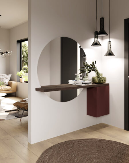 Bonito recibidor que cuenta con un original marco espejo, estante en chapa natural de roble carbón y módulo 1 puerta en lacado burdeos. Da la mejor bienvenida a tus visitas.