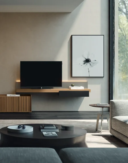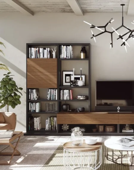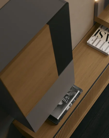 Ambiente para salón con composición acabada en Grafito Mate y Roble Humo.