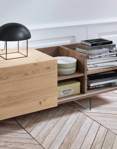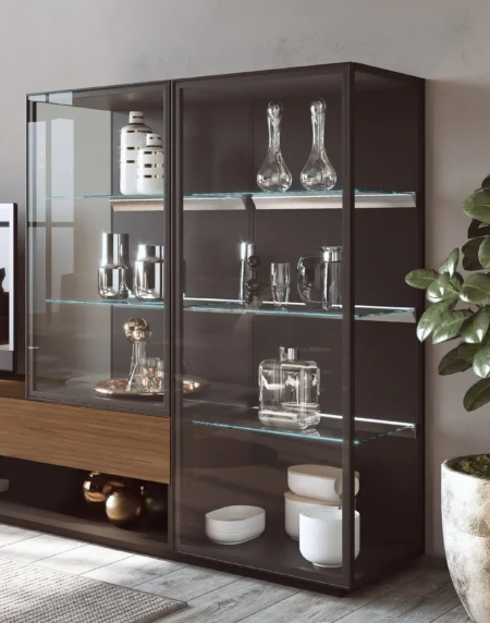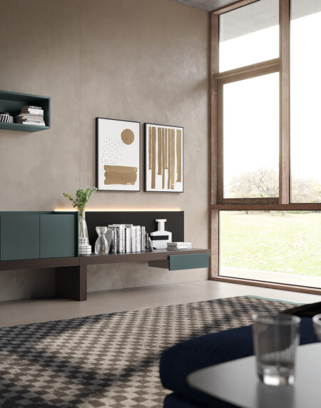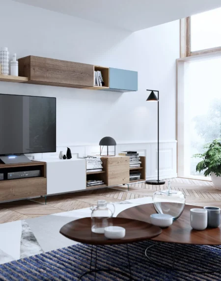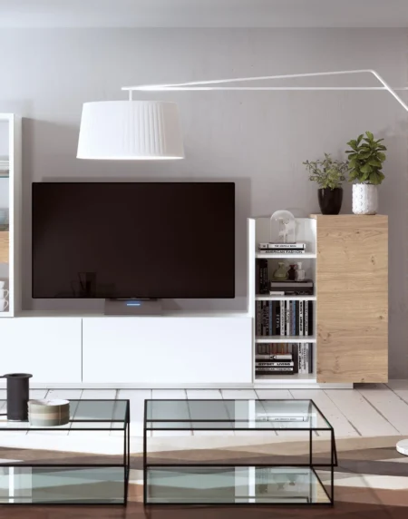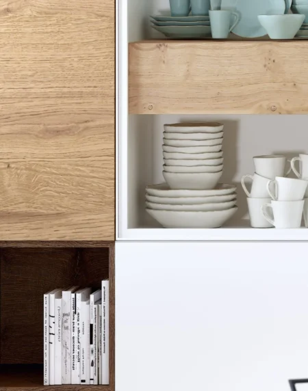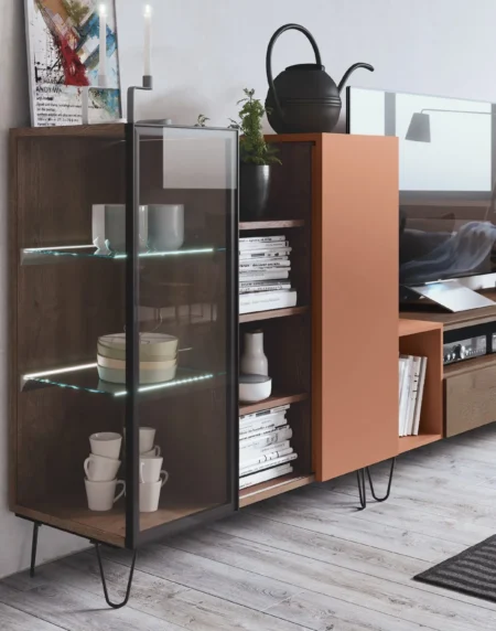 Composición compuesta de módulo bajo, vitrina y estantería cubos altos, con sus formas desiguales aportan ligereza al conjunto.