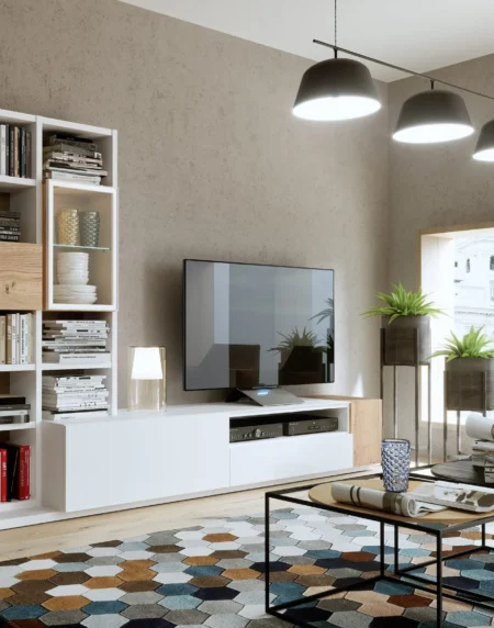 Formas geométricas en esta composición, así se pretende aportar serenidad y armonía, pero a la vez utilidad y capacidad. La elegante combinación de sus colores aportan bienestar a tu salón.