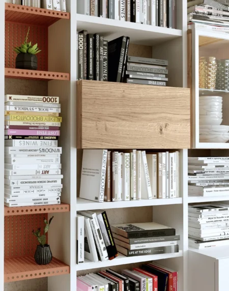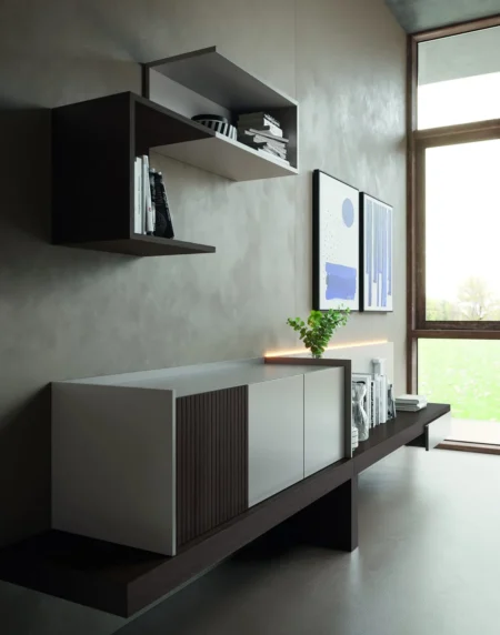 Ambiente de líneas rectas y modernas, módulos altos y bajos combinándose entre sí, una linea atemporal de diseño.