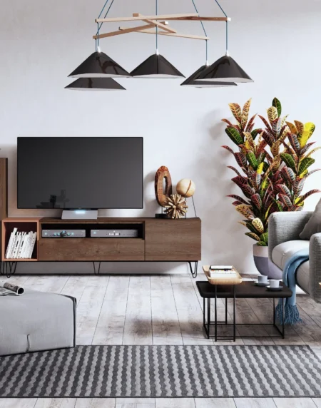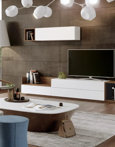 Tú salón a la última con esta composición en Piedra Mate y Roble Humo.