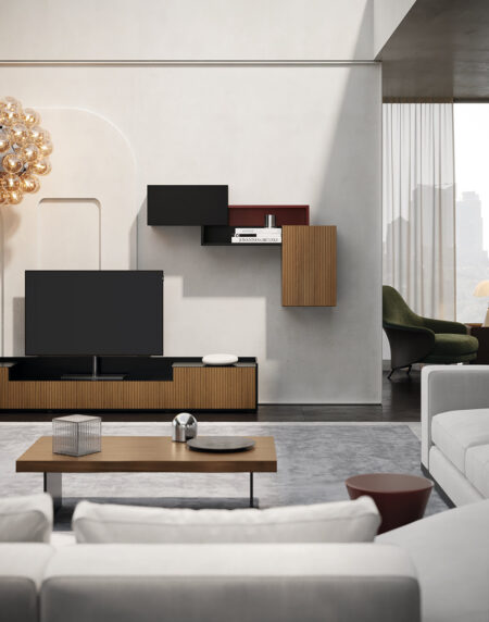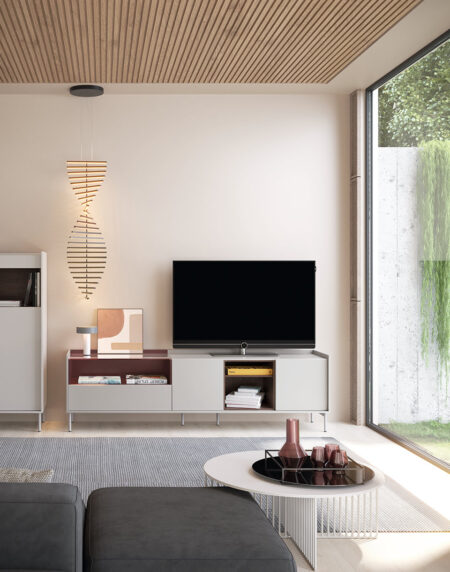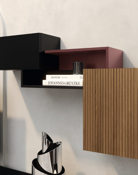 La madera alistonada: el gran protagonista de esta propuesta que aparece representada en el mueble tv y en el modulo alto. Se combina con los lacados burdeos y negro. Adaptable a cualquier espacio.