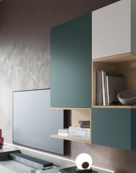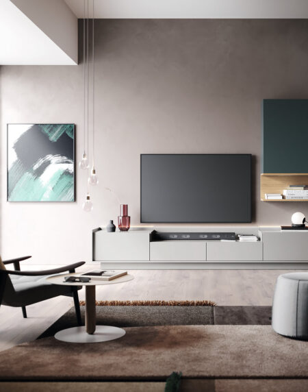 Composición presentada en chapa natural roble liso y lacados piedra y verde comodoro. Su modulo alto es personalizable tanto en sus módulos de puerta como estantería así como dota a tu salón de gran capacidad.