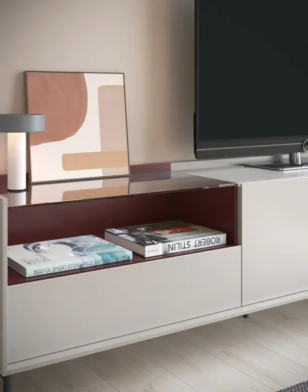 Aparador y mueble tv personalizable 100%. Lacado piedra con chapa de madera roble carbón y lacado burdeos. Las estanterías integradas en cada modulo le otorgan una gran ligereza y elegancia a tu hogar.