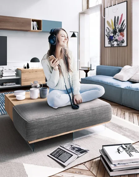 Mesa de centro con cojín-cajón formada por Roble Montana y Tapizado Gris.