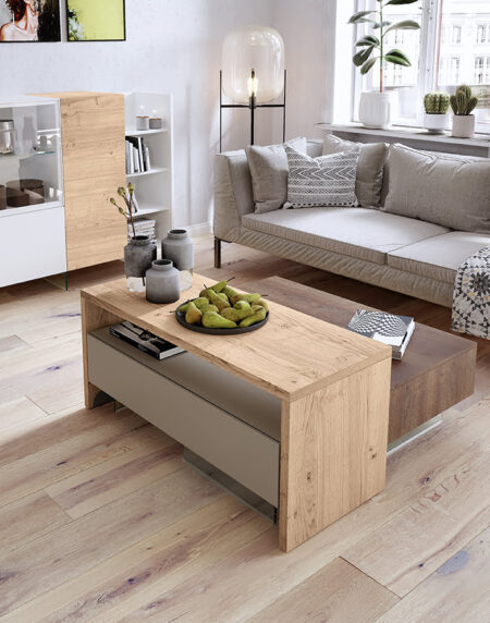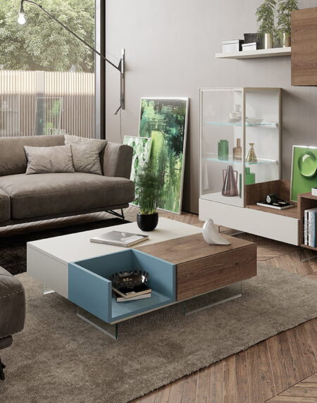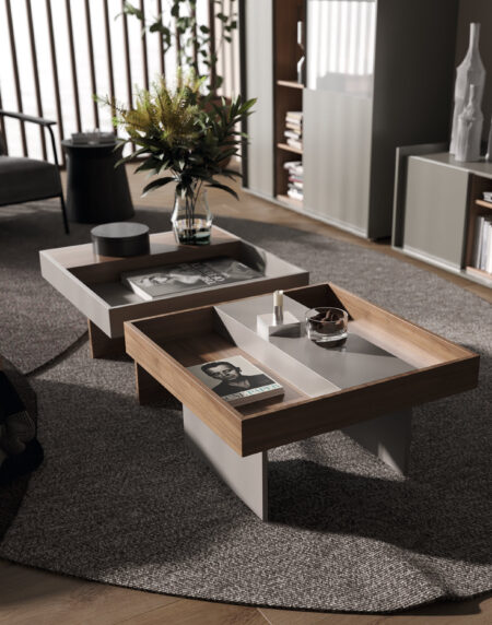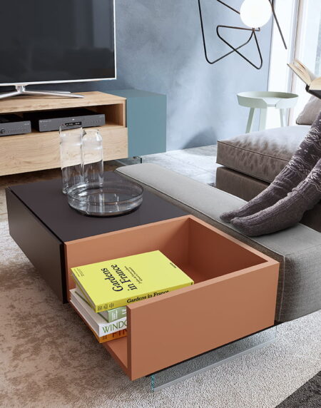 Mesa de centro que combina cajón, mesa elevable y bandeja lacada. Se pueden combinar multiples acabados.