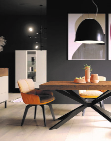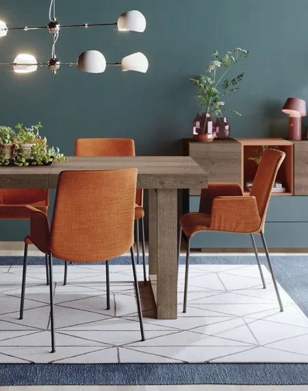 Nogal Nature con toques de Calabaza. El Blanco como base marca completamente la personalidad del ambiente. Sus líneas depuradas aportan carácter y estilo.