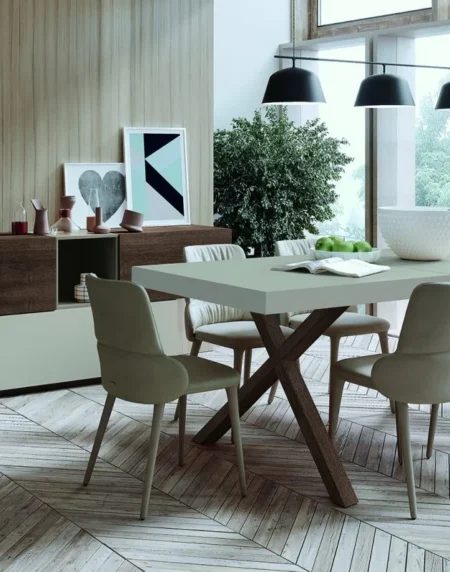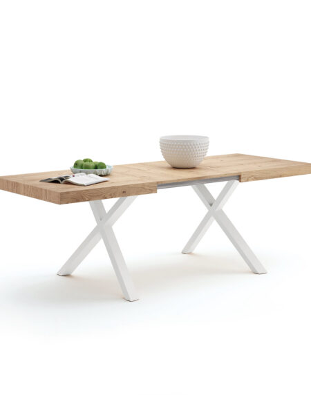 Bonita mesa X combinable con laca y chapa de madera. Dispone de 2 extensibles que se guardan en la misma mesa para que puedas compartir el espacio con los tuyos.