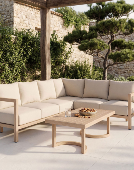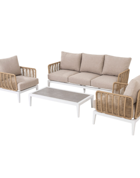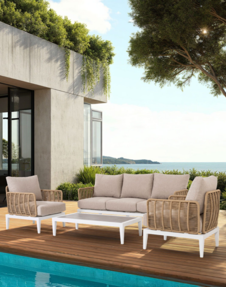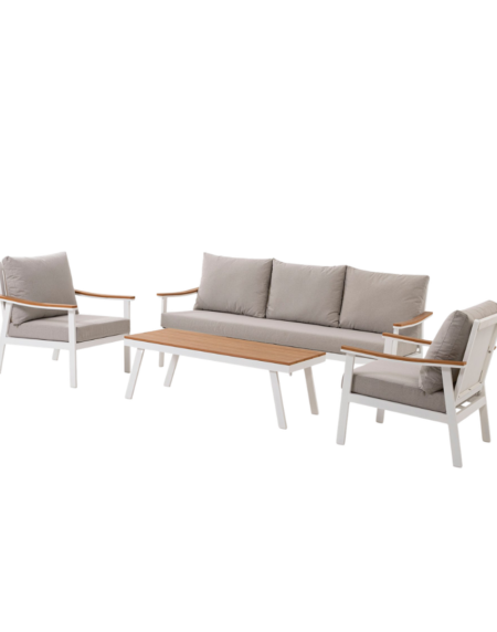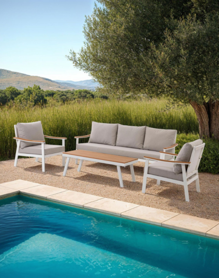 El set de exterior Corinto ofrece una combinación perfecta entre elegancia, confort y resistencia. Incluye sofás y mesa de centro con estructura de aluminio blanco, un material ligero y duradero frente a las condiciones climáticas. La mesa incorpora detalles en madera sintética, que aportan un acabado cálido y natural sin