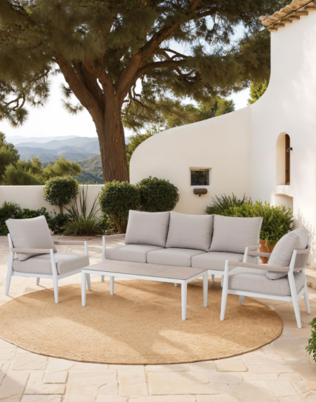 El set de terraza Formentor está diseñado para ofrecer confort y estilo en espacios exteriores. Incluye sofás y una mesa de centro con estructura de aluminio blanco, un material ligero, resistente y de fácil mantenimiento, ideal para ambientes al aire libre. Los asientos en tapizado beige aportan suavidad, comodidad y