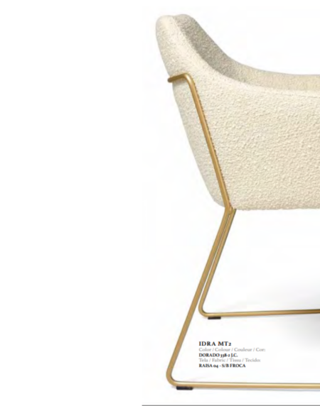 Disponible con patas de madera o metal en acabados negro epoxi, blanco epoxi, cromo, oro epoxi. Barnizado, lacado o color muestra