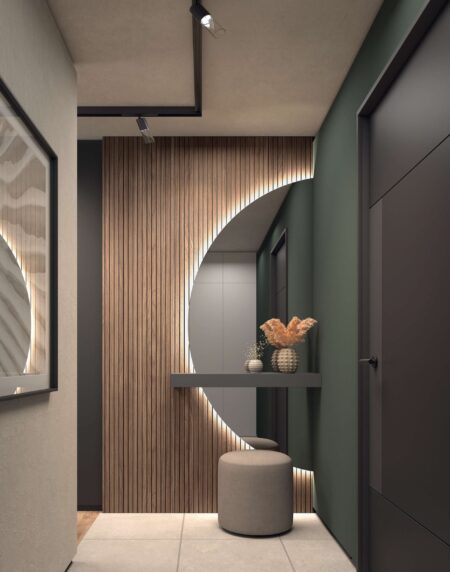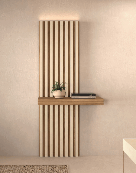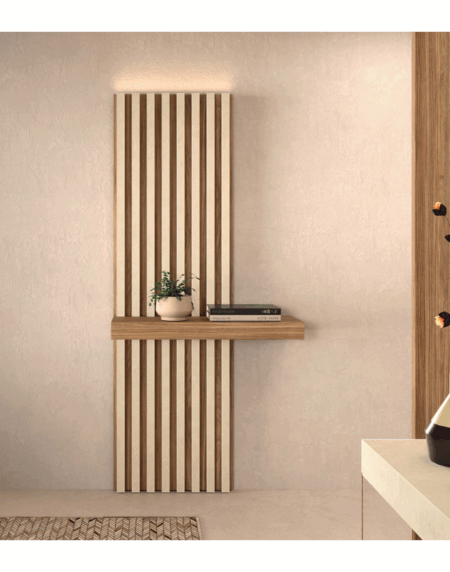 Una zona de entrada con apoyo para lámpara y esos pequeños objetos que dejamos al entrar. Sistema giratorio en espejo adaptable y práctico.
