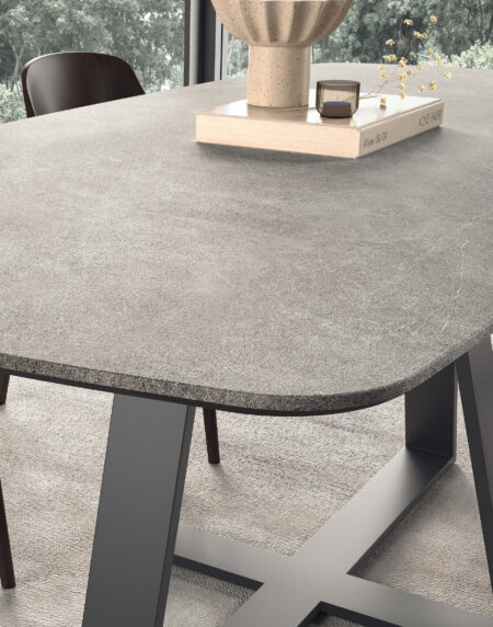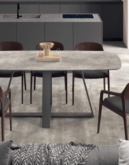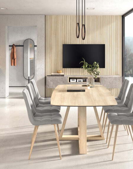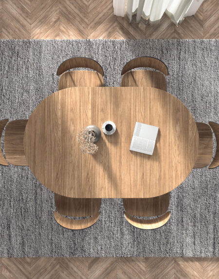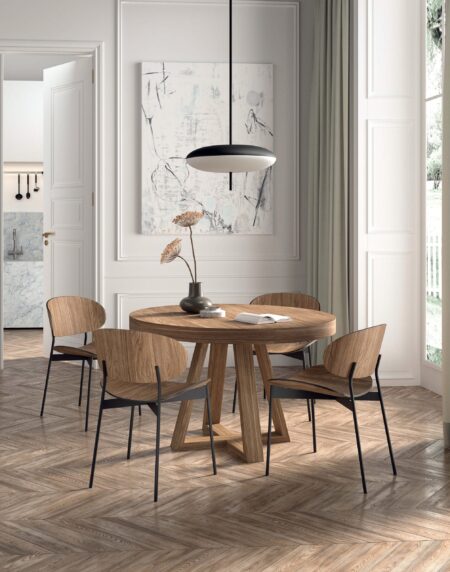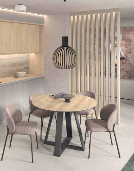 Muy de actualidad, la mesa redonda cada vez más presente, con superficies en todos los acabados de piedras y maderas. Su tapa consistente en forma de chaflán y canto fino para un aspecto más sutil. Opcional y muy práctico para compartir tus platos favoritos entre familia y amigos con el