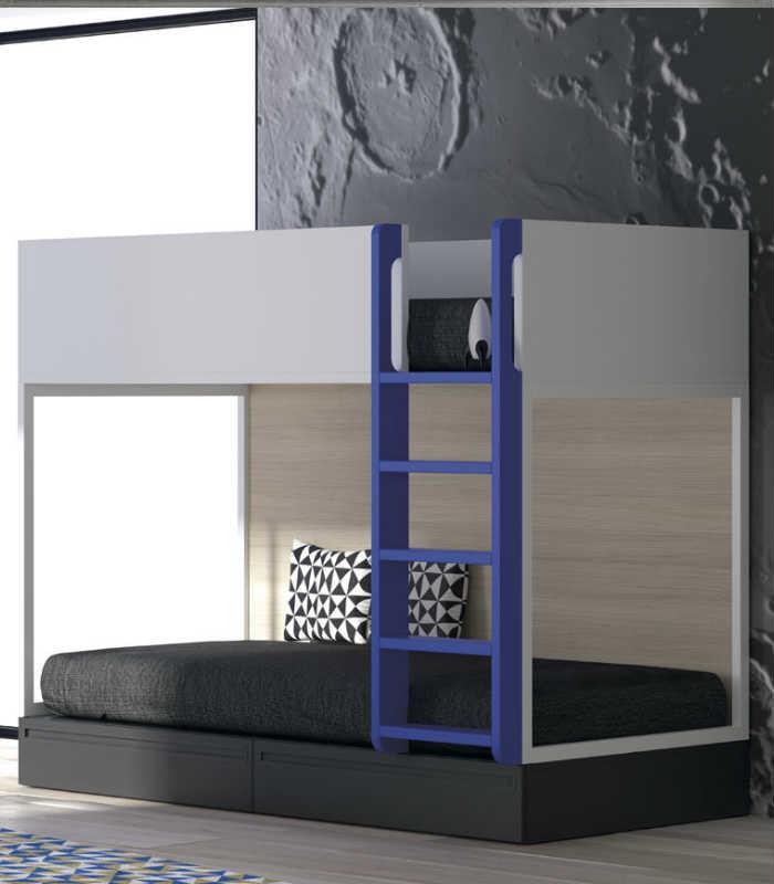 La Litera infantil DR tiene protector cerrado y dos cajones cubo bajo la litera con tirador integrado. Es de líneas rectas, sencillas y elegantes. Combinable con cualquier elemento, aportando sensación de espacio abierto.