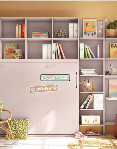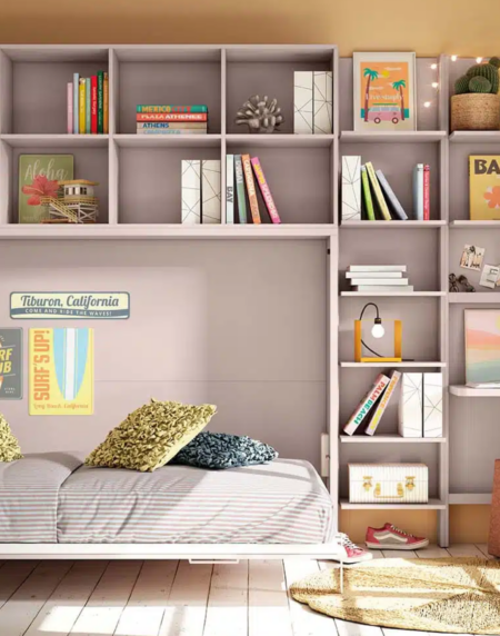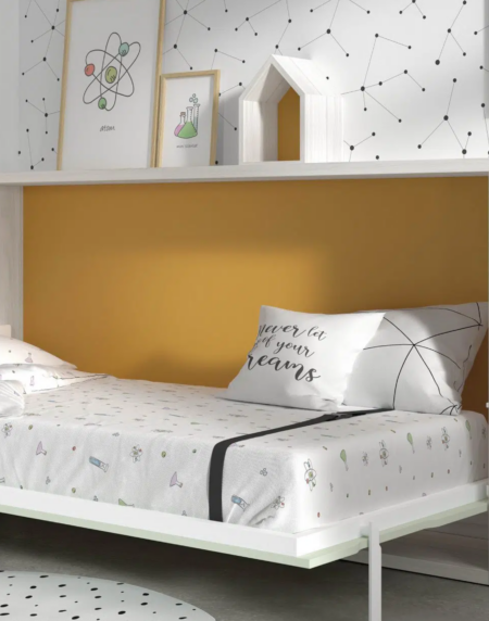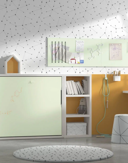 ¿Amante de las ciencias? Tu habitación con cama abatible, aparte de práctica y cómoda, tiene todos los detalles que reflejan tu science core: el papel de pared, las láminas decorativas, el textil… acércate a una tienda distribuidora y empieza tu proyecto a medida. Personaliza cada estante a tu manera. Puedes