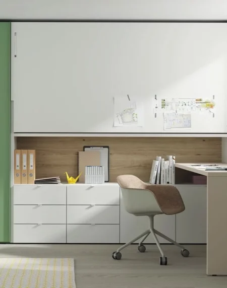 Puedes tener una zona estudio en la parte inferior de la cama abatible Una solución modular muy cómoda y práctica para espacios reducidos Podría ser un dormitorio juvenil, de adolescente, de single, tú eliges Hemos hecho una propuesta de dormitorio que seguro te va a gustar, donde no hemos catalogado para quien es, ¡dejamos que