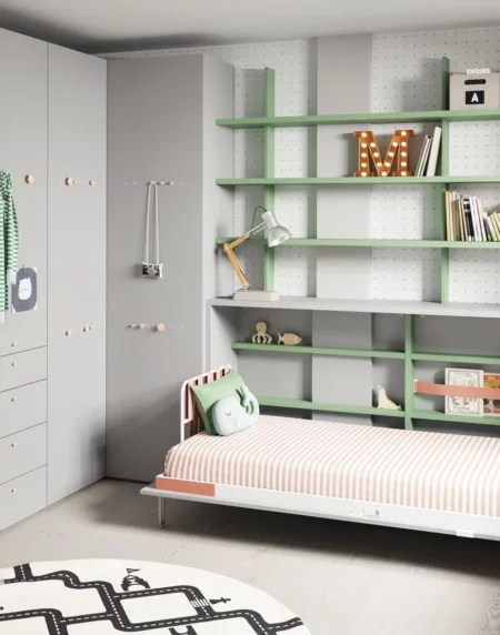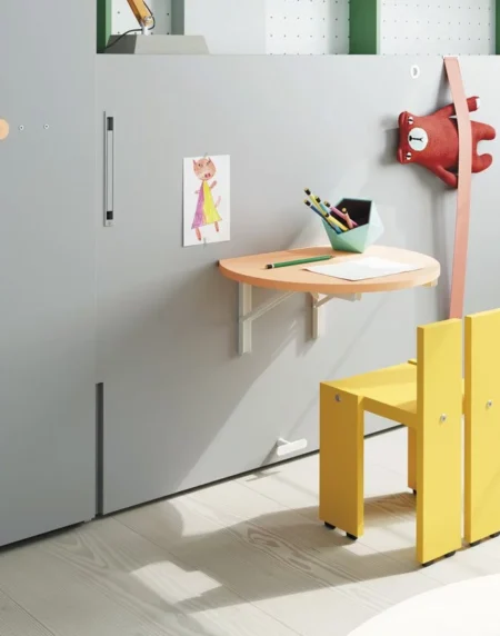 Una cama abatible es la solución para los peques, cuando dejan la cuna Aprovecha el frontal de la cama para colocar una pequeña mesa El tirador Dot colocado en el armario hace las veces de colgador Si necesitas tener una composición de muebles para tu hijo que cubra todas sus necesidades, esta sin duda