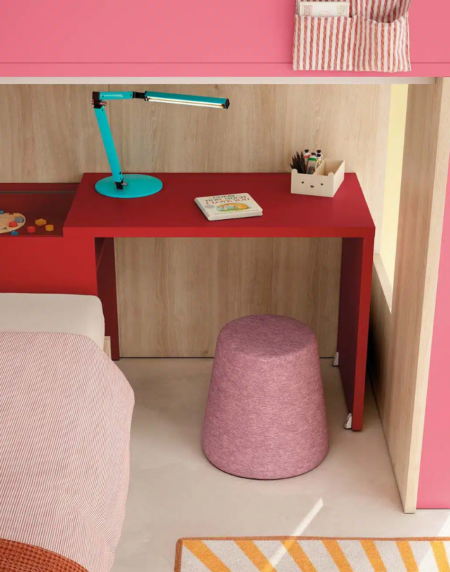 La luminosidad de la estancia juvenil resalta los acabados que se han utilizado para combinar, que son el NUDE y el TÓRTORA, complementado con los tonos de madera de