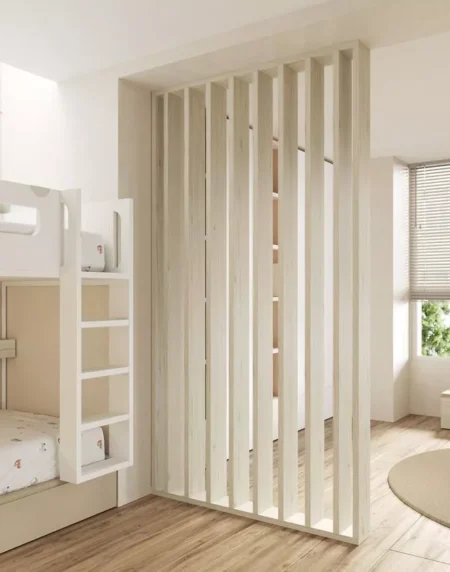 Habitación juvenil con litera y separador de ambientes fijo o móvil