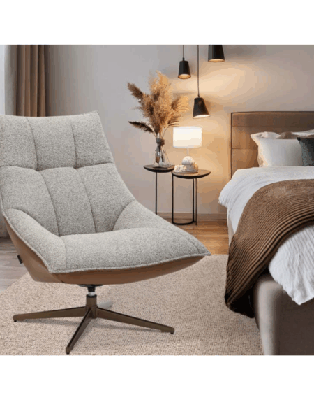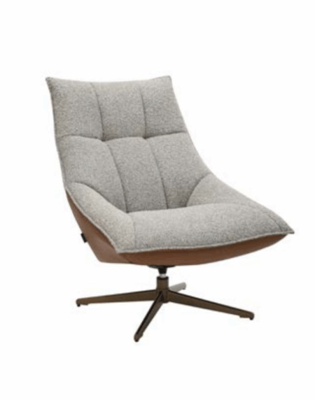 Sillon tapizado en tela combinada con cuero sintético. Giratoria con pata de metal lacado.