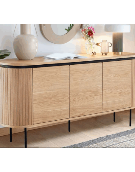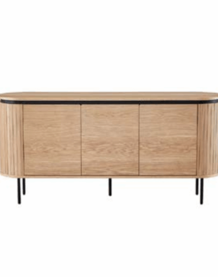 Aparador con estructura de MDF, acabado en chapa de roble o nogal, patas metálicas lacadas en negro.