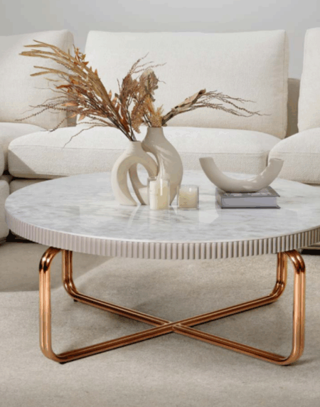 Estructura de mesa de MDF con encimera en compuesto de piedra; patas de metal rosa. Ø 80x35 cm / Ø 60x45 cm