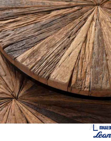 Cada mesa presenta una tapa circular de madera reciclada, resaltando la belleza natural y la textura única de la madera. Las patas, hechas de hierro lacado en negro mate, aportan un toque moderno y elegante.