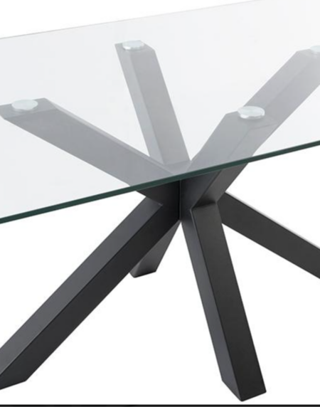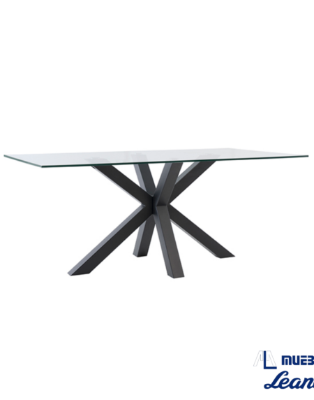 Mesa fija 140x90 cm con tapa de cristal templado de 12 mm de espesor y patas de metal en color negro que dotan mucha personalidad a la mesa gracias a su forma.