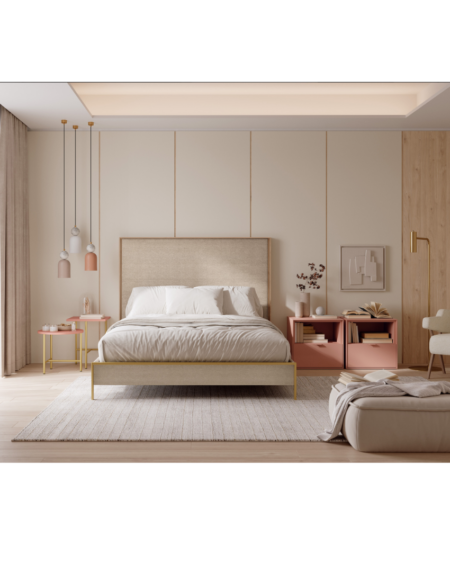 Os presentamos el dormitorio de la colección ED2. Ideal para tu habitación de matrimonio o doble. Con cabezal acolchado y complemento de dos tablones de madera de nogal laminada. Éste se conjunta con dos mesitas disponibles en diferentes tonos