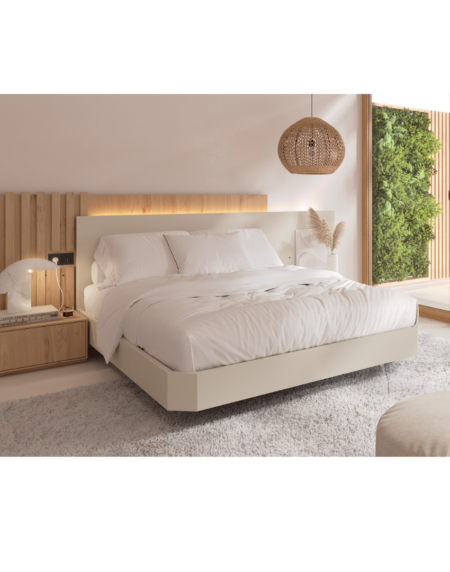 Cabezal con panel central tapizado en blanco y laterales en roble natural. LEDs modelo 7 en los laterales.