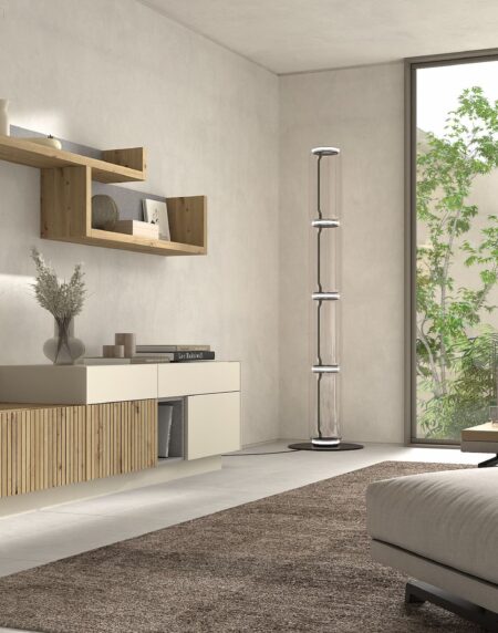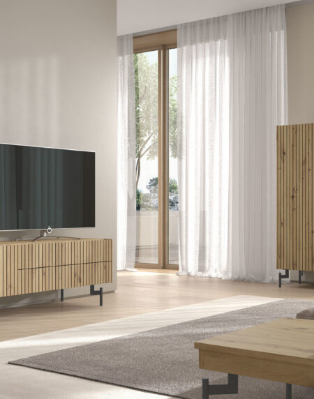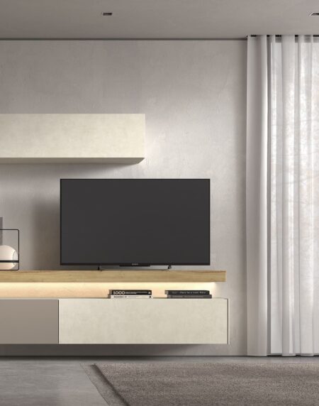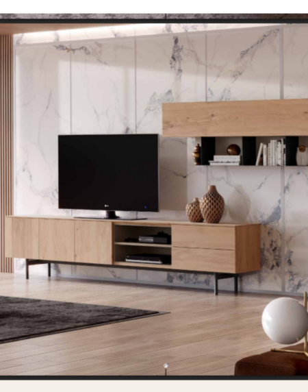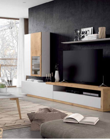 Os presentamos una propuesta de mueble tv completo con almacenamiento ideal. Tarimas de ocho centímetros de espesor colgadas, para crear un ambiente más depurado y detalle de cantos laterales en acabado aserrado, sensación de madera natural.
