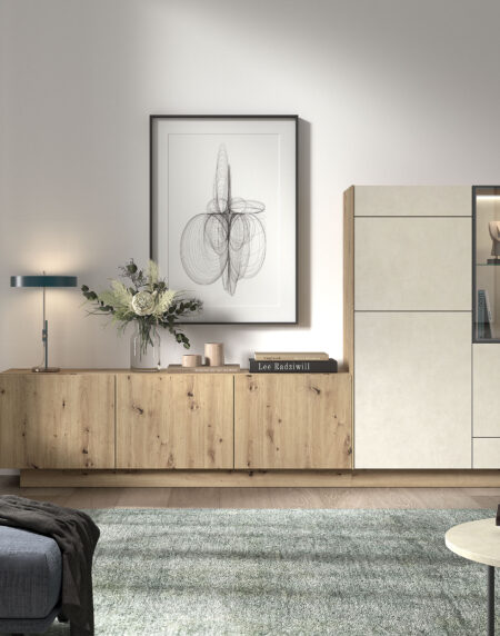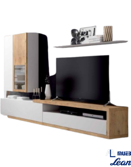 Composición de mueble tv + vitrina a conjunto en madera de roble artesanal y lacado calizo en sus puertas.