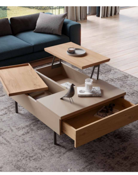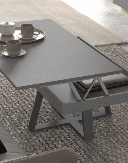 Composición de muebles de salón a conjunto junto a una vitrina con luz LED. Además, también tiene una mesa elevable funcionalmente ideal. Elige entre todos los sistemas de patas, metálicas, metacrilato…