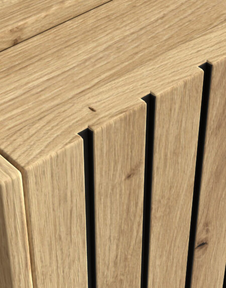La belleza de las puertas en madera con franjas para todo el conjunto del mobiliario sobre madera roble artesano y pie metálico, una combinación actual muy atractiva.