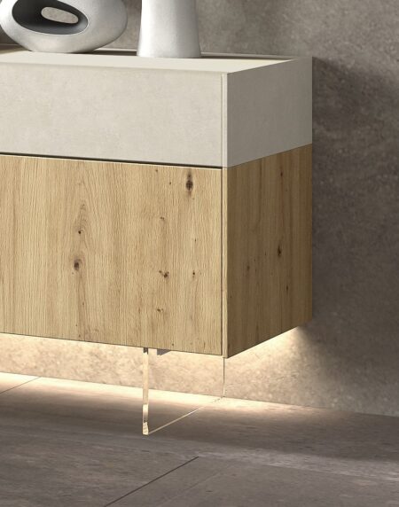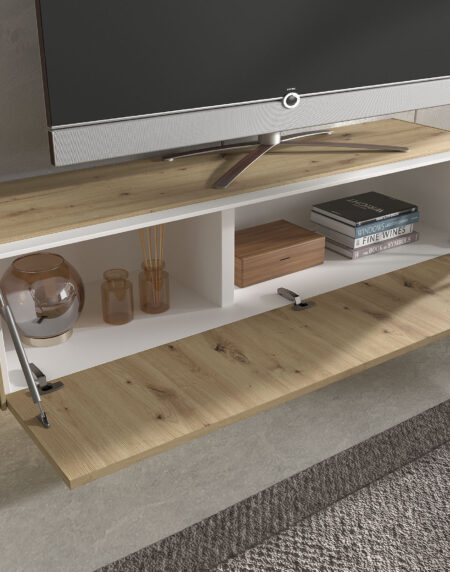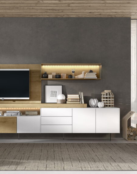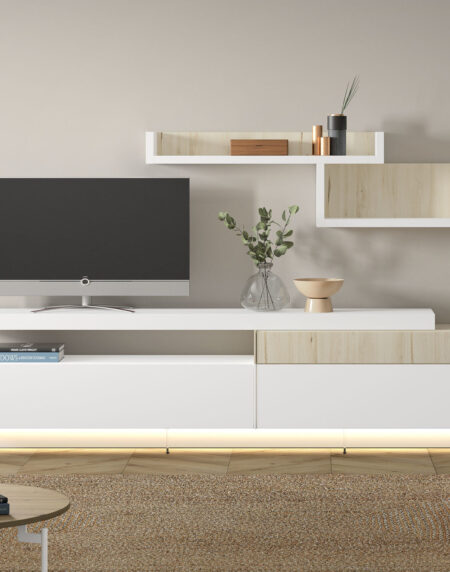 Composición de mueble tv de la colección de Ilusion Day de estilo nórdico. Está compuesta por una base de TV y un módulo superior que combinan la madera de roble con la laca blanca. También se puede añadir un estante superior opcional