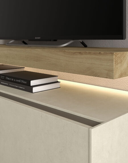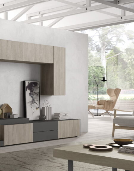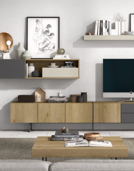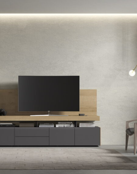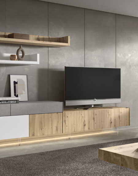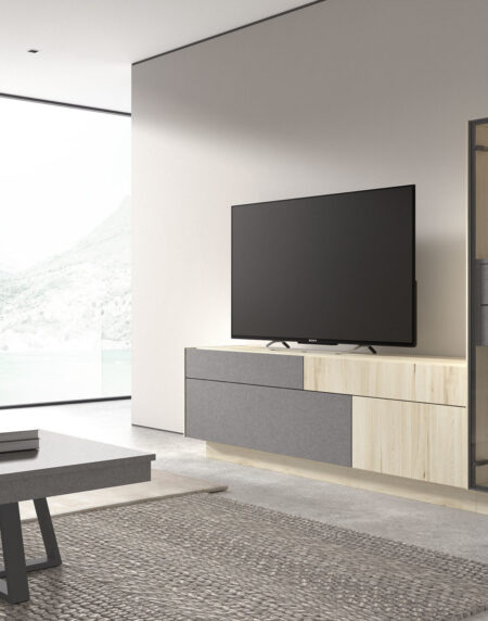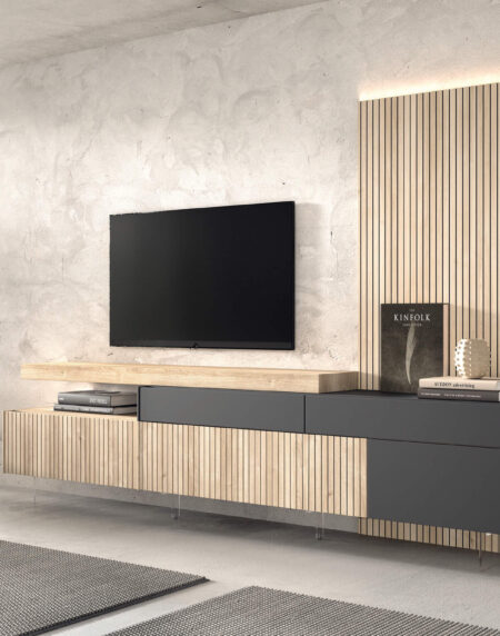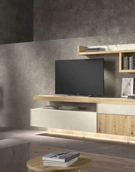 Te presentamos el conjunto de TV moderno combinando madera de roble natural con gris pizarra y beige.