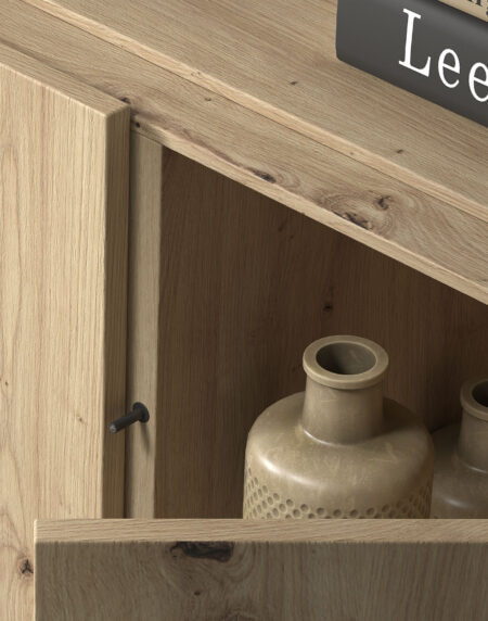 Este conjunto de salón en madera de roble natural combina diseño funcional y estética cálida para crear un espacio acogedor y organizado. El mueble de TV ofrece una solución de almacenaje generosa, con múltiples compartimentos cerrados para mantener todo en orden. Sobre la televisión, un estante cerrado con tapa proporciona