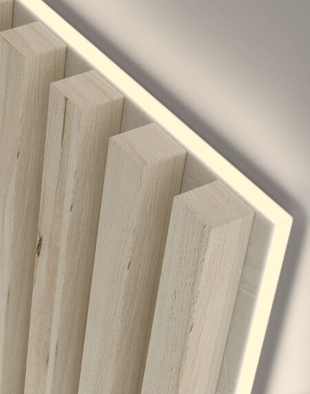 Paneles lisos y alistonados mezclados para amueblar de manera distinta con personalidad. Sistema integrado perimetral de luz cálida con mando a distancia.
