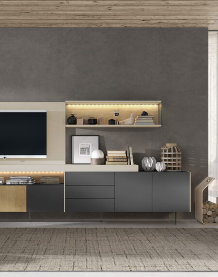 Composición de mueble de televisión combinada con los materiales de madera de Olmo gris y Gris pizarra.